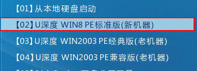 1、将u深度u盘启动盘连接至电脑,重启等待出现开机画面按下启动快捷键F12进入到启动项选择窗口,选取【02】U深度WIN8PE标准版(新机器),按回车键执行操作,如图所示: